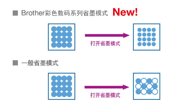 選擇Brother省墨模式可以節(jié)省墨粉消耗。兄弟彩色數(shù)碼系列省墨模式是通過縮小墨點空間來完成的,墨點的數(shù)量沒有改變,即使使用了省墨模式也不會影響打印質(zhì)量。